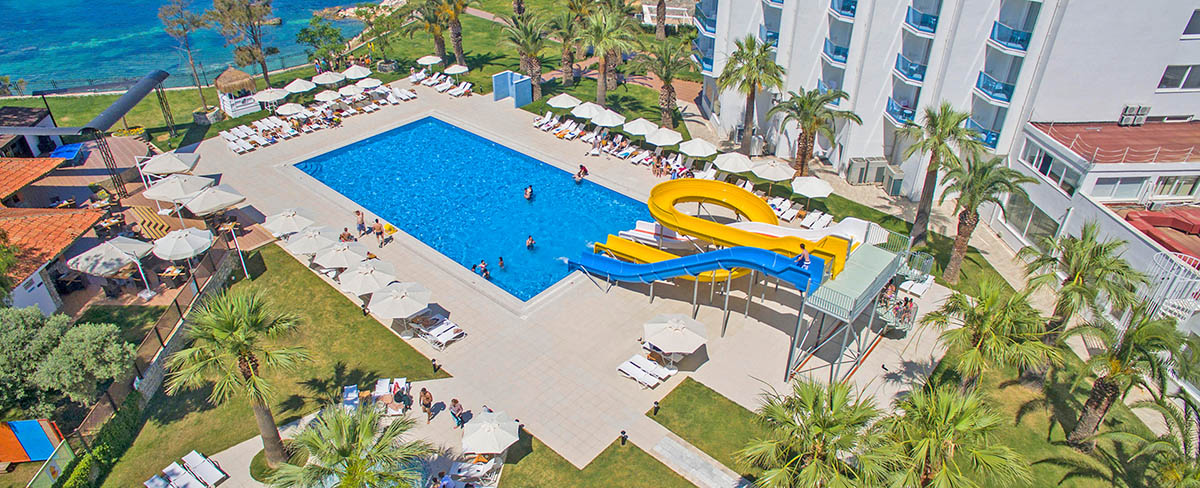 Boasting stunning views out to the beautiful Aegean Sea, this luxurious beach resort is ideally located on a peninsula at the end of Ladies Beach and at just 3 km from the centre of Kusadasi.